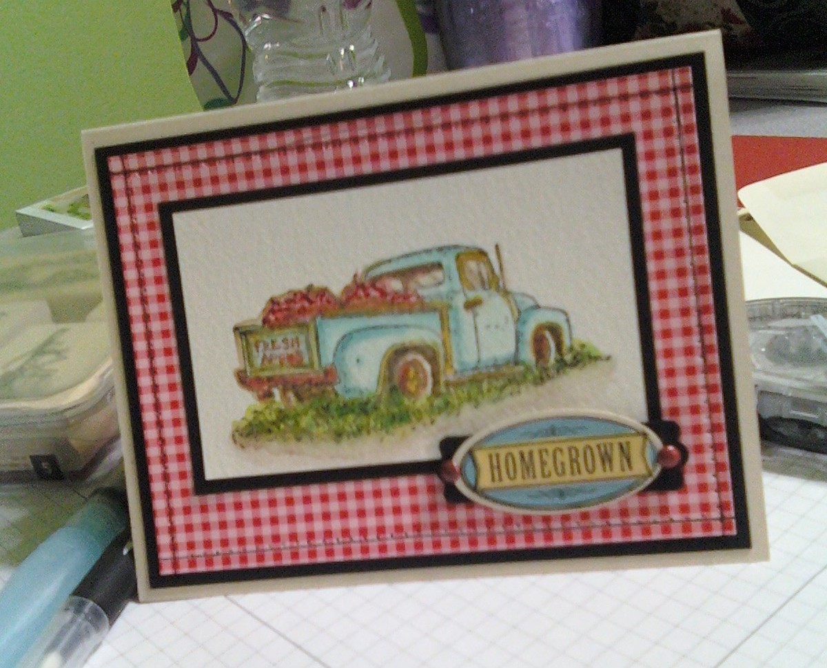 There are so many wonderful ways to watercolor cards, etc. with the products that Stampin' Up has....so I did a class to improve my weak watercoloring skills. Here is one of the cards I made in it - this is one of the stamps in the Countryside stamp set. When I showed it to my husband, even he was impressed! I wonder if the fact that it was a picture of a TRUCK that he liked lol. Here are a couple more pictures of my card: